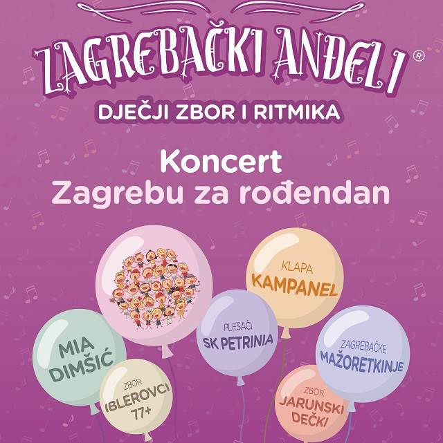 Zagrebu za rođendan:prvi samostalan koncert dječjeg zbora i ritmike Zagrebački anđeli® u velikoj dvorani 'Vatroslav Lisinski' pod ravnanjem njihovog umjetničkog voditelja pijanista maestra Vitomira Ivanjeka-Vite i akademske flautistice Ines Ivanjek uz atraktivne goste: klapu Kampanel, djeci omiljenu Miu Dimšić, Zagrebačke mažoretkinje, višestruke međunarodne plesne pobjednike plesače PK Petrinia te muški zbor Jarunski dečki i mješoviti zbor Iblerovci 77+. Kako izgleda kad zapjevaju sve generacije zajedno uvjerite se sami!
