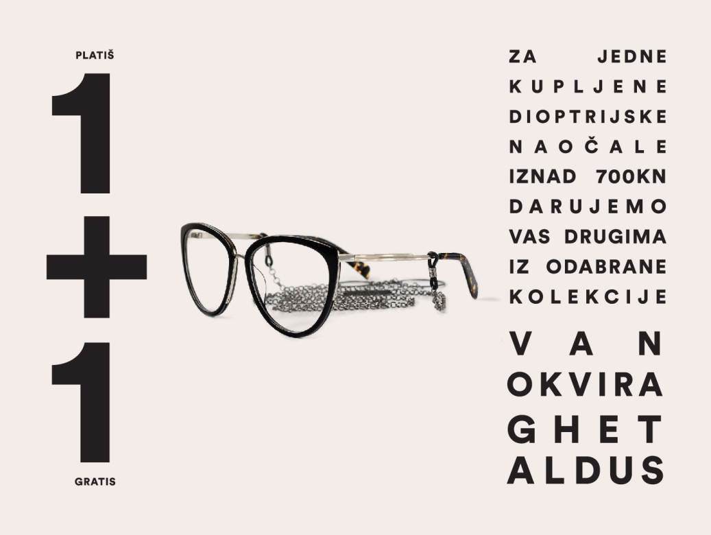 Osim pristupačnih cijena i trendi okvira, aktualna akcija nudi mogućnost da, uz kupnju jednih naočala u vrijednosti većoj od 700 kuna, druge iz odabrane kolekcije dobijete na dar. Također ne zaboravite da je novi dioptrijski okvir dugoročna investicija, a pravilnim odabirom jednog od visoko kvalitetnih okvira isti ćete bez problema uklopiti u vaše svakodnevne odjevne kombinacije. S obzirom na to da je riječ o vašem vidu, u Ghetaldus poslovnicama vas čeka i stručni tim koji osim o izgledu brine i o onom puno važnijem - vašem zdravlju. Dakle, osim akcije 1+1 provjeri besplatno svoj vid i odradi kontrolni pregled prije same kupnje.
