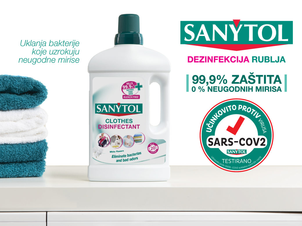 Bakterije i gljivice na rublju izvor su neugodnih mirisa i mogu prenositi bolesti ili uzrokovati iritaciju kože, pa je stoga SANYTOL razvio sredstvo koje učinkovito čisti i dezinficira rublje.