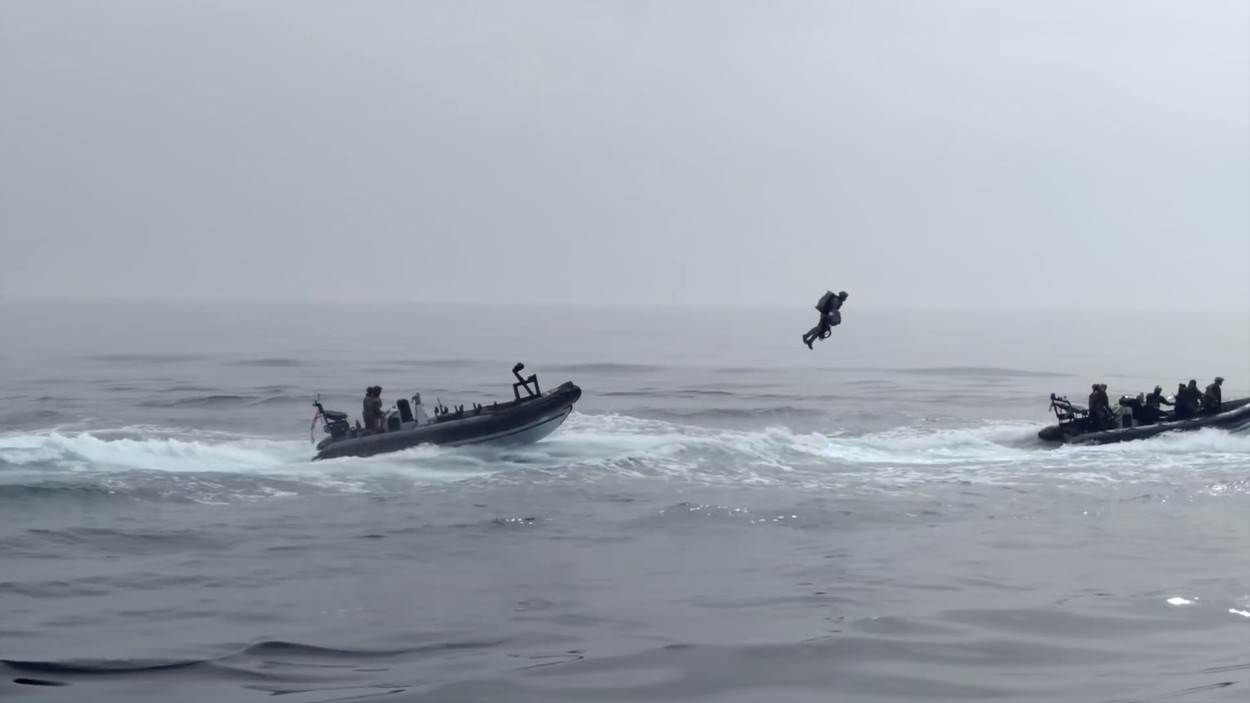Marinac na sebi ima mlazno odijelo koje koristi četiri mlazna motora postavljena na leđa te se uz potisak veći od 1000 KS nakon dizanja u zrak ukrcava na oteti brod. Radi se o vojnoj vježbi u kojoj član elitnih borbenih snaga pokazuje kako će u budućnosti izgledati vraćanje otetih teretnih brodova i tankera s naftom