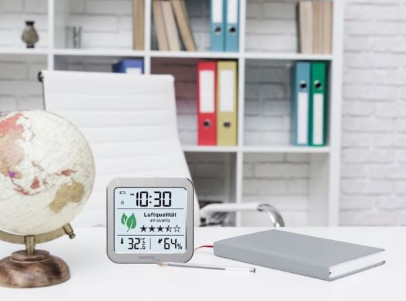 Ima bijelo pozadinsko osvjetljenje s preporukom za ventilaciju, mjerenje putem snažnog senzora miješanog plina (VOC), Prikaz unutarnje temperature, prikaz vlažnosti u zatvorenom prostoru, kvarcni sat, alarm s funkcijom odgode.