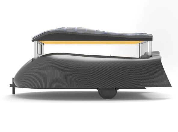 Ova lagana prikolica za kampiranje dizajnirana je kako bi pomogla vlasnicima električnih vozila da povećaju domet vozila. Towable ima aerodinamičnu konstrukciju koja zadržava futuristički oblik kako bi se smanjio otpor, ali ne i domet električnog vozila predrastično.