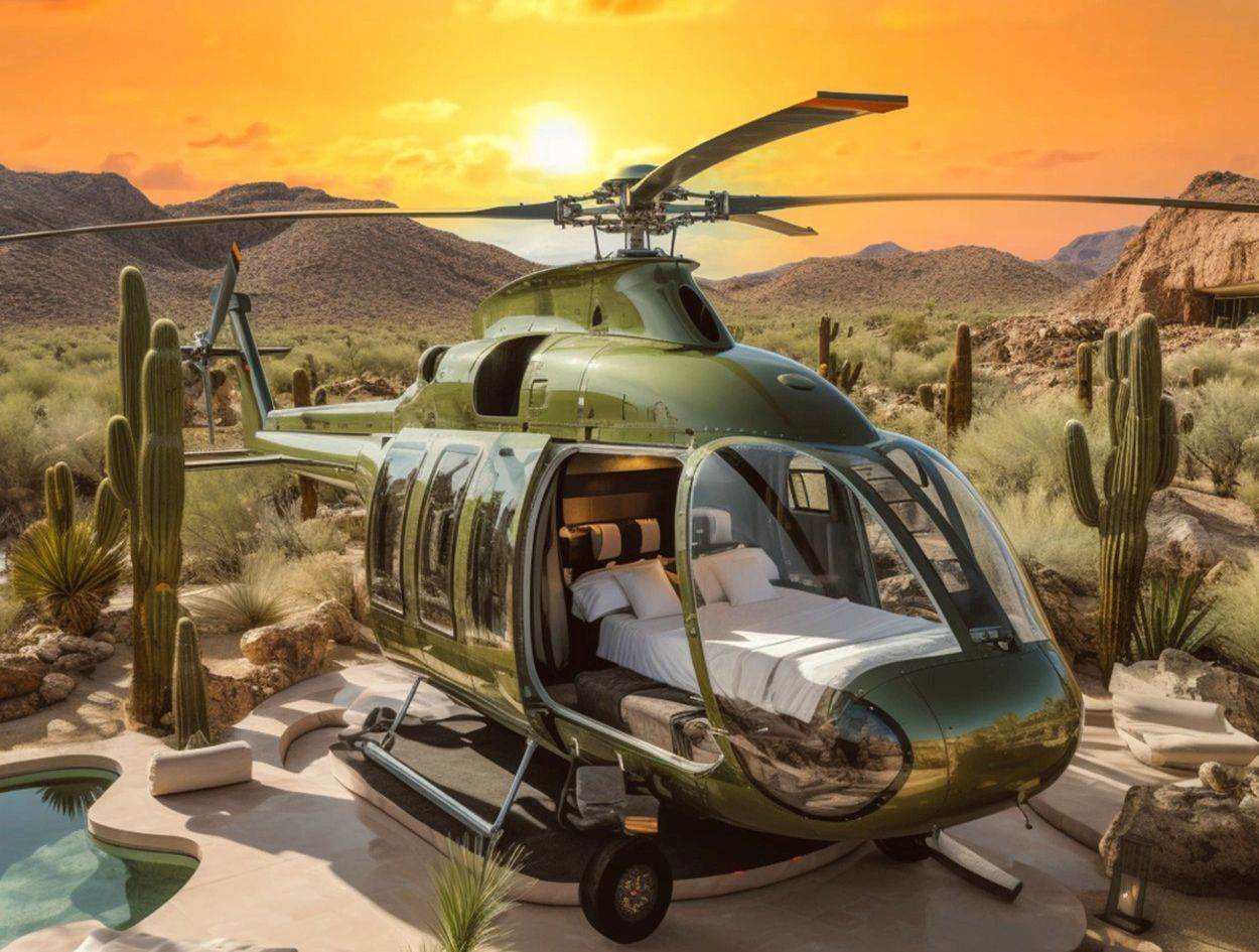 Kalifornijska građevinska tvrtka Mega Remodeling predstavila je “Helicopter glamping resort”. Ovo odmaralište trebalo bi se nalaziti u blizini Nacionalnog parka Joshua Tree u Kaliforniji, a svečano otvorenje planirano je za prvi kvartal 2024.