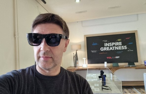 TCL NXTWEAR AIR su zanimljive naočale o kojima smo već pisali, a sad smo ih imali po prvi put i isprobati u Barceloni. Na unutarnjoj strani Dual MicroOLED stakala naočala koje izgledaju kao uobičajene dioptrijske ili sunčane naočale može se gledati sadržaj s drugog uređaja. Recimo, putujete avionom, spojite naočale kabelom na svoj pametni telefon i gledate fullHD (1080p) film u dijagonali od 140 inča. Bez ikakve pikselizacije, zamora za oči, uz odličan prikaz boja i kontrasta.