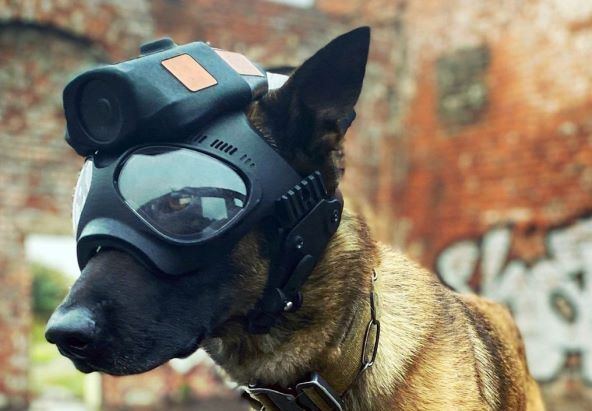 Policijski psi su poput kiborga opremljeni kacigama kako bi pomogli u hvatanju prevaranata. Pokrivala za glavu imaju video kameru visoke rezolucije i također uključuju zaštitne naočale.