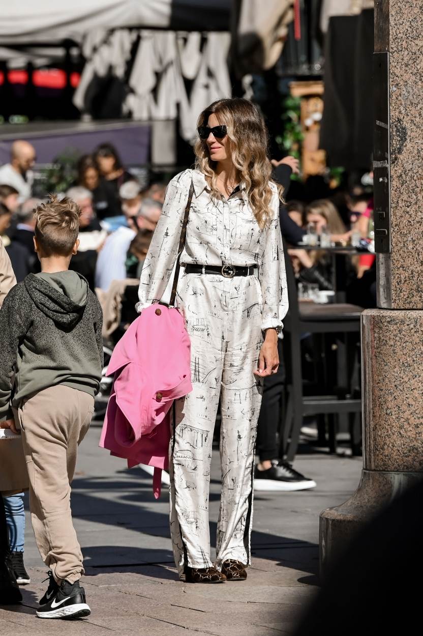 Svileni kombinezon s potpisom modne kuće Burberry rasprodan je u rekordnom roku, a iskombinirala ga je s popularnim crnim Gucci remenom te Gucci mokasinkama s petom i monogramom. U ruci je držala baloner jarke ružičaste boje, a na ramenu se nazirala Louis Vuitton torba.