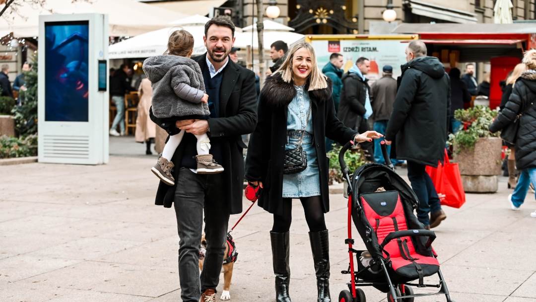 Špicu na Badnjak u Zagrebu nije propustio ni sportski novinar i reporter Nove TV, Milan Stjelja. Centrom Zagreba prošetao je s partnericom, kćeri i psom.