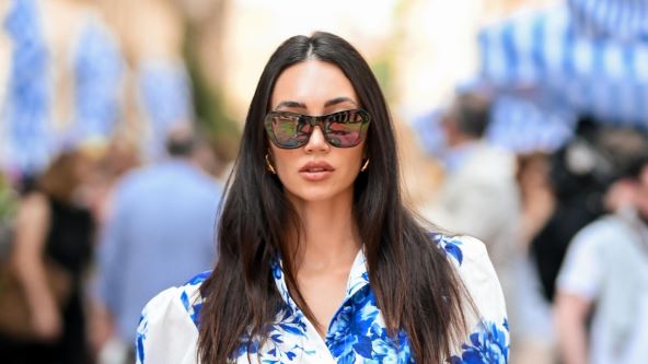Ona se špicom prošetala u bijeloj haljini s predivnim uzorkom od plavih cvjetova, kao stvorenoj za proljetne šetnje. Haljina je kraća, s dugim rukavima, strukirana i s naglašenim ramenima.