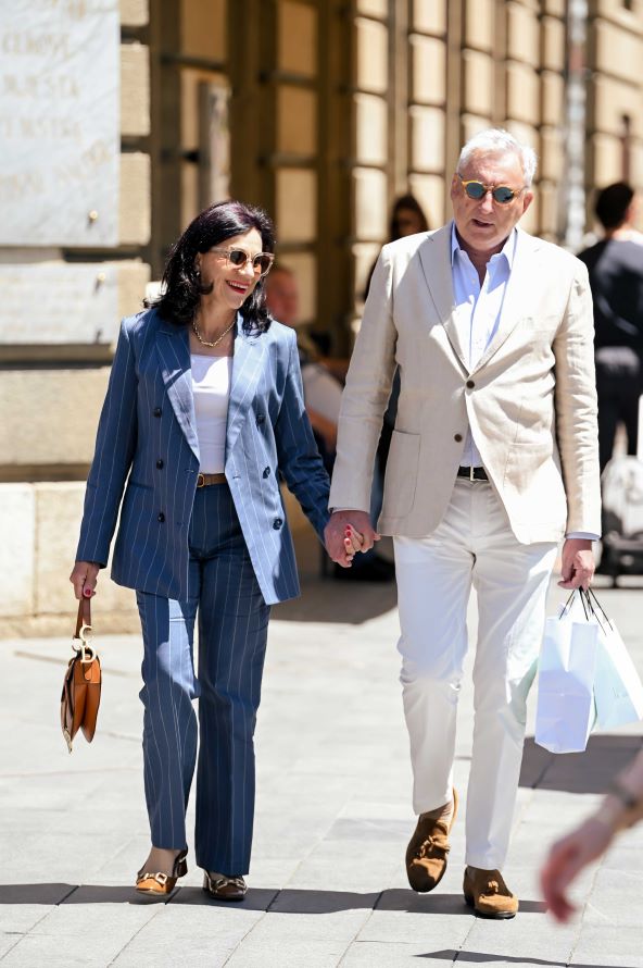 Naime, odlučila se za odijelo u tamnoplavoj boji s tankim bijelim prugama, a ispod sakoa je nosila bijelu majicu. Svoj vikend look je upotpunila zlatnim nakitom, smeđom torbicom i cipelama iste boje.