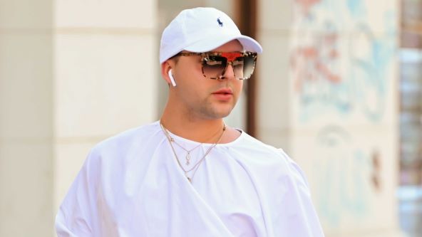 Špicom je prošetao u laganoj širokoj bijeloj tunici koju je upario s bež kratkim hlačama i bijelom šiltericom brenda Ralph Lauren, a oči je sakrio iza sunčanih naočala.