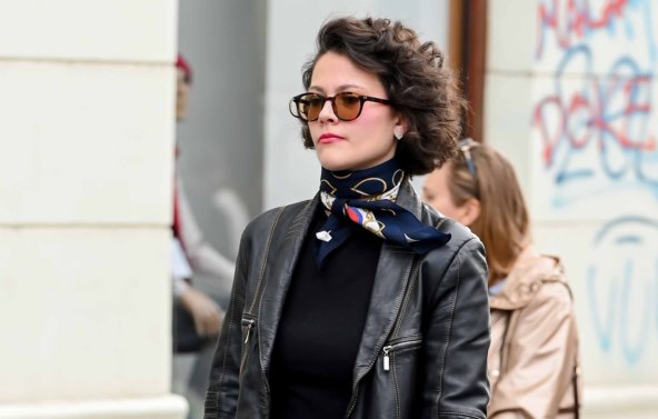 Kombinirala je klasičniji gornji dio s crnom bluzom i vintage kožnom jaknom te ukrasnom maramom oko vrata s istaknutim donjim dijelom.