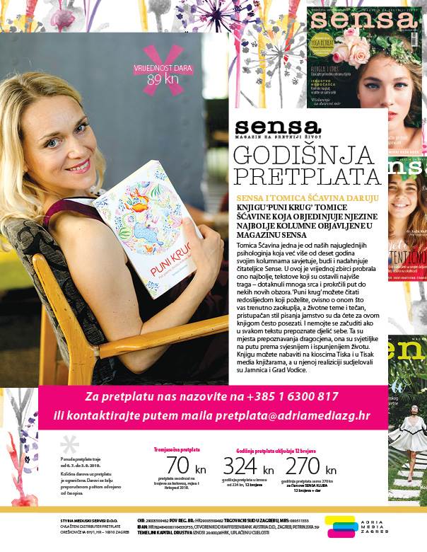 Tomica Šćavina jedna je od naših najuglednijih psihologinja koja već više od deset godina svojim kolumnama savjetuje, budi i nadahnjuje čitateljice Sense. U ovoj je vrijednoj zbirci probrala ono najbolje, tekstove koji su ostavili najviše traga – dotaknuli mnoga srca i prokrčili put do nekih novih obzora. ‘Puni krug’ možete čitati redoslijedom koji poželite, ovisno o onom što vas trenutno zaokuplja, a životne teme i tečan, pristupačan stil pisanja jamstvo su da ćete za ovom knjigom često posezati. I nemojte se začuditi ako u svakom tekstu prepoznate djelić sebe. Ta su mjesta prepoznavanja dragocjena, ona su svjetiljke na putu prema svjesnijem i ispunjenijem životu. Knjigu možete nabaviti na kioscima Tiska i u Tisak media knjižarama, a u njenoj realiziciji sudjelovali su Jamnica i Grad Vodice.