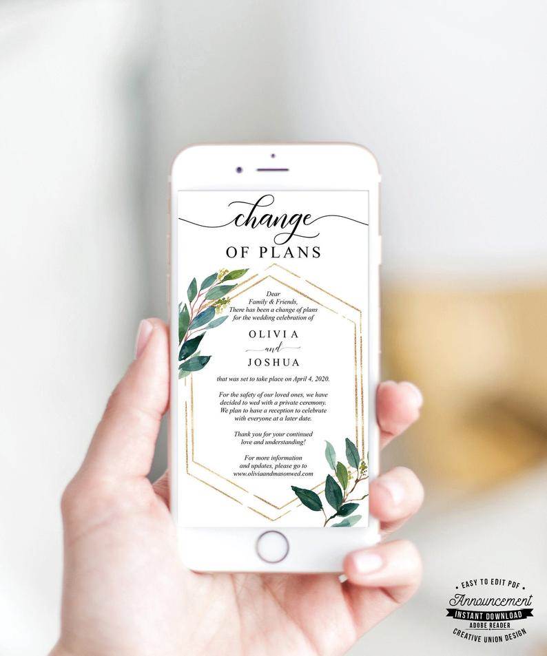 Odgodili ste vjenčanje. Ili ste se odlučili za novi trend – simbolično vjenčanje na daljinu. Tužni ste ali shvaćate ozbiljnost situacije izazvane koronavirusom. Obavijestili ste obitelj, kumove i uzvanike. Telefonski i e-mailom. Ali nešto vam nedostaje? U potpunosti vas razumijemo i zato svima koji žele ovo tmurno doba u svijetu vjenčanja učiniti vedrijim donosimo lijepe ideje. Ideje vezane o pripremi obavijesti o odgodi vjenčanja, virtualnom vjenčanju, obavijest s novim datumom... primjeri su preuzeti od kretivnih pojedinaca, na engleskom su jeziku ali svojom su estetskom formom odlična inspiracija.