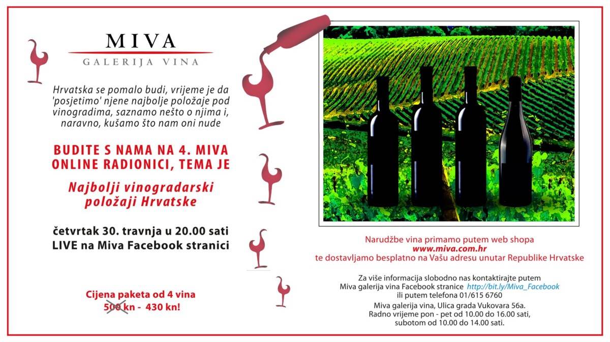 I ovaj četvrtak MIVA galerija vina nastavlja s edukativnim online radionicama na Facebook profilu! Ovaj put koncept je malo promijenjen, neće unaprijed biti objavljeno koja vina će se kušati. Mali „hint“ je da su to Najbolji vinogradarski položaji Hrvatske. A kad je položaj najbolji, onda su i vina takva.