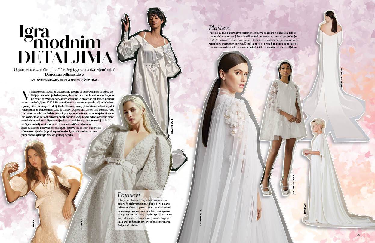 olimo bridal modu ali obožavamo modne detalje. Jer osim što su odraz modno aktivnog svijeta brojnih dizajnera, detalji su i odraz osobnosti mladenke, ono po čemu će se svaka modna priča razlokovati. A što će se od detalja nositi u sezoni proljeće/ljeto 2022.? Prema viđenom na nedvano predstvaljenim kolekcijama nemoguće će biti odoliti obručima za kosu, plaštevima i velovima, ali i rukavictama te pojasevima. I dok se na prvi tren čini da to i nije neka novost mi pozivamo da zavirite u fotografije jer ova se modna priča kroji kroz umjetnost kombiniranja. Pa tako jednostavni se outfit poput bijelog bridal odijela odlično slaže s raskošnim velom, a čipkasta vjenčanica naglašena pojasom razbija mit kako su čipkaste haljine stvorene samo za romantične mladenke. Sve to ali i puno više vas očekuje na stranicama novog broja Story vjenčanja, jer mi obožavamo bridal modu!