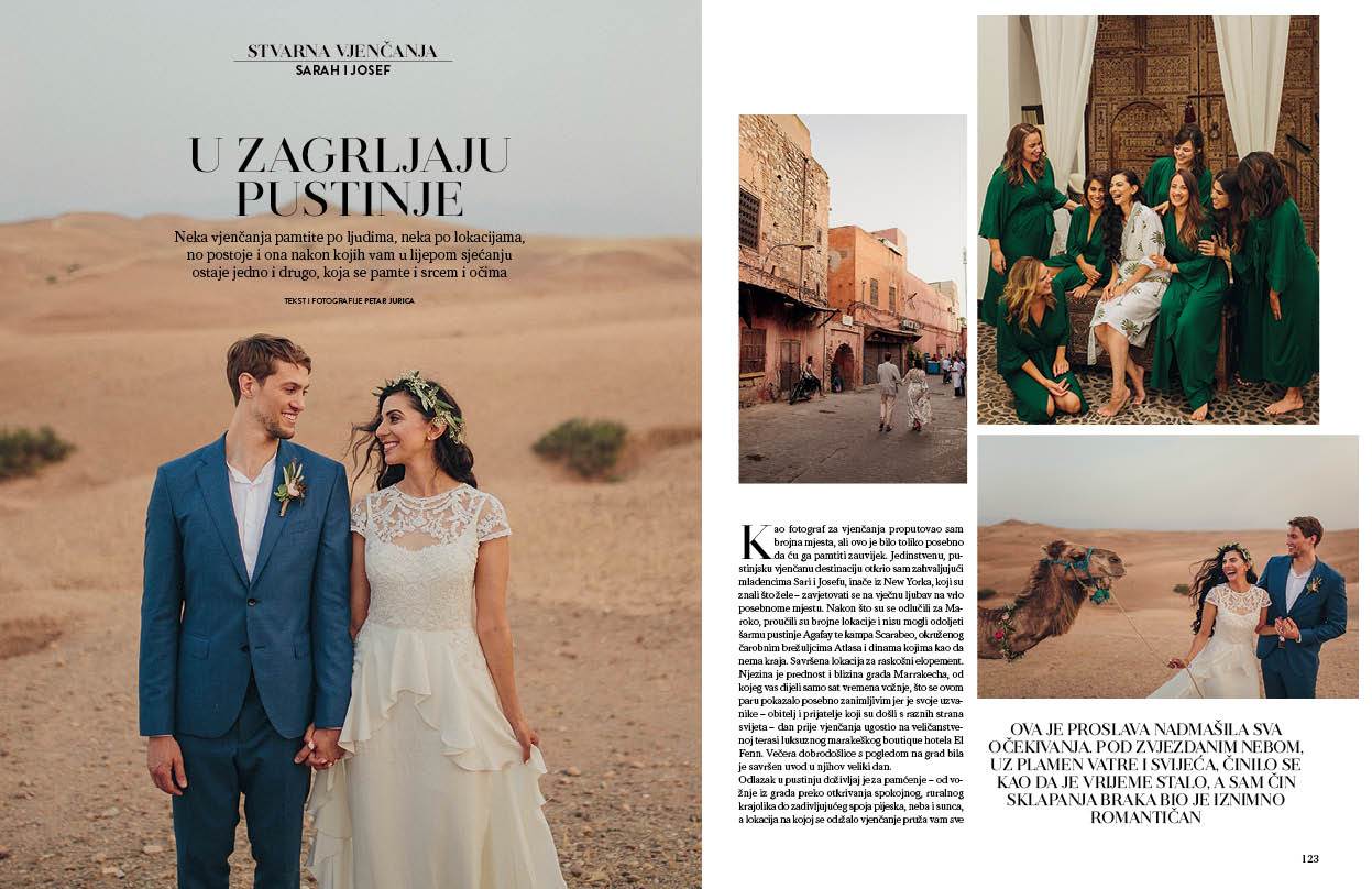 "Kao fotograf za vjenčanja proputovao sam brojna mjesta, ali ovo je bilo toliko posebno da ću ga zauvijek pamtiti. Jedinstvenu, pustinjsku vjenčanu destinaciju otkrio sam zahvaljujući mladencima, Sari i Josefu, inače iz New Yorka, koji su znali što žele – zavjetovati se na vječnu ljubav na vrlo posebnome mjestu. Nakon što su se odlučili za Maroko, proučili su brojne lokacije i nisu mogli odoljeti šarmu pustinje Agafay te kampa Scarabeo, okruženog čarobnim brežuljcima Atlasa i dinama kojima kao da nema kraja..." Petar Jurica