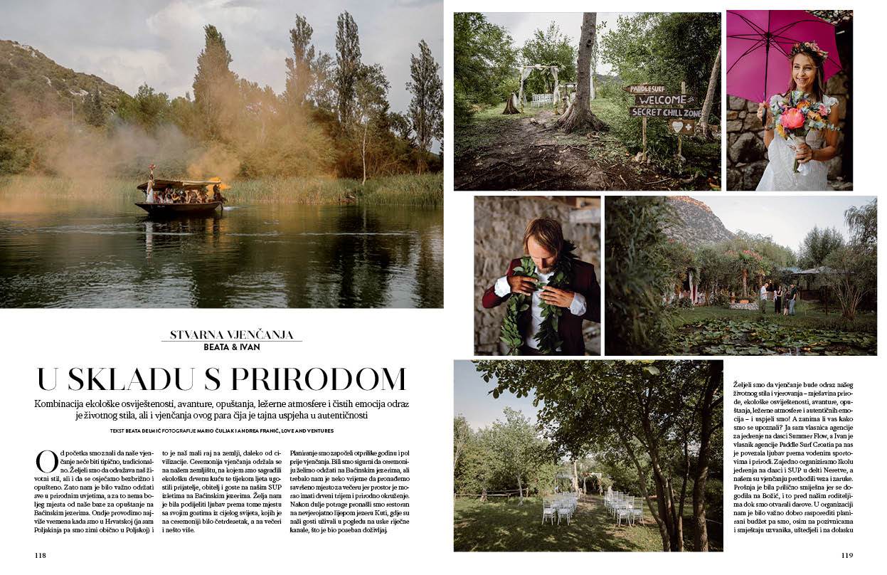 "Od početka smo znali da naše vjenčanje neće biti tipično, tradicionalno. Željeli smo da odražava naš životni stil te se osjećati bezbrižno i opušteno. Zato nam je bilo vrlo važno održati sve u prirodnim uvjetima, a za to nema boljeg mjesta od naše baze za opuštanje na Baćinskim jezerima. Tamo provodimo najviše vremena kad smo u Hrvatskoj (ja sam Poljakinja pa smo zimi obično u Poljskoj) i to je naš mali raj na zemlji, daleko od civilizacije. Ceremonija vjenčanja održala se na našem zemljištu, na kojem smo sagradili ekološku drvenu kuću i tijekom ljeta ugostili prijatelje, obitelj i goste na Baćinskim jezerima. Naša je želja bila podijeliti ljubav prema tome mjestu sa svojim gostima iz cijelog svijeta, kojih je na ceremoniji bilo četrdesetak, a na večeri i nešto više." Već su i prve rečenice priče o vjenčanju Beate i Ivana divna najava priče o vjenčanju u zagrljaju prirode, vjenčanju kao odrazu osobnosti ali i životnog stila dvoje ljudi. Ova je priča potvrda da su vjenčanja okrenuta prema prirodi i održivosti čarobna kao i sva ona klasična vjenčanja. Divne fotografije snimili su Andrea i Mario iz Love and Ventures, dvojac koji nam u novom broju vjenčanja donosi i divnu priču pustolovnim vjenčanjima.