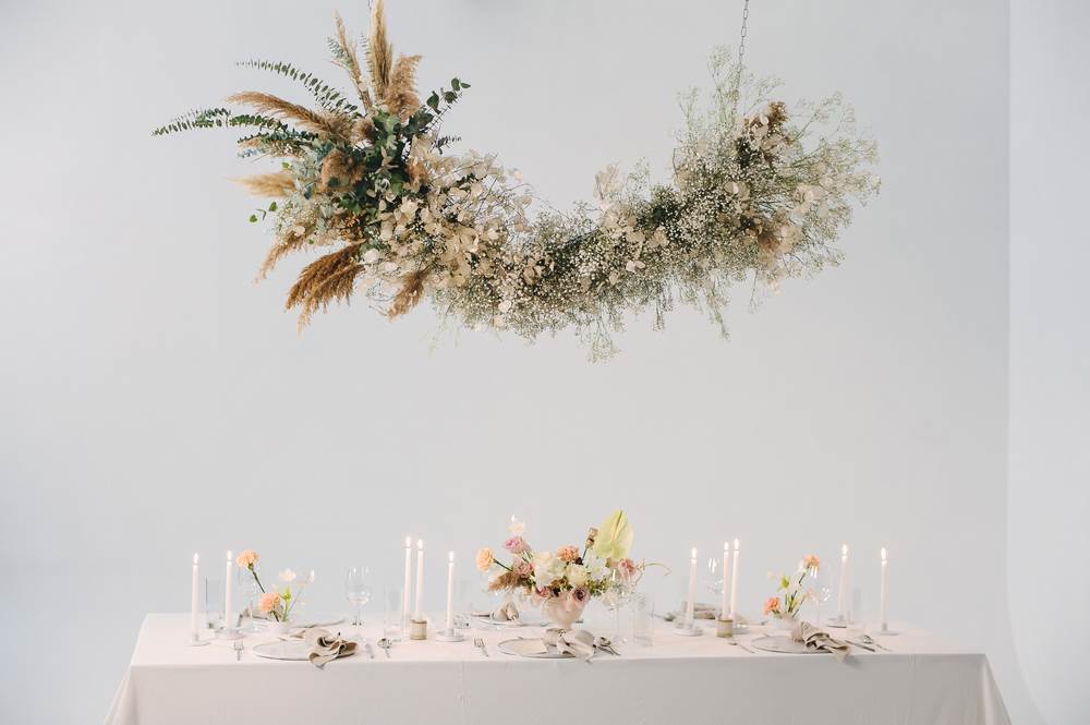 Viseće instalacije mogu biti izrađene od raznolikog cvijeća, zelenila, suhog bilja (odlična ideja za održiva vjenčanja) te cvjetnim i biljnim vrstama, bojama i teksturama biti savršeno povezane s dekoracijom stola. Za istaknuti je kako upravo dekoracija na stolu može biti vrlo jednostavna, povezana s visećom instalacijom detaljima poput pojedinačnim cvjetovima u mini vazama i svijećama u boji vjenčanja. Zamislite samo kako ova dekoracija može biti važan dio vaših fotografija!