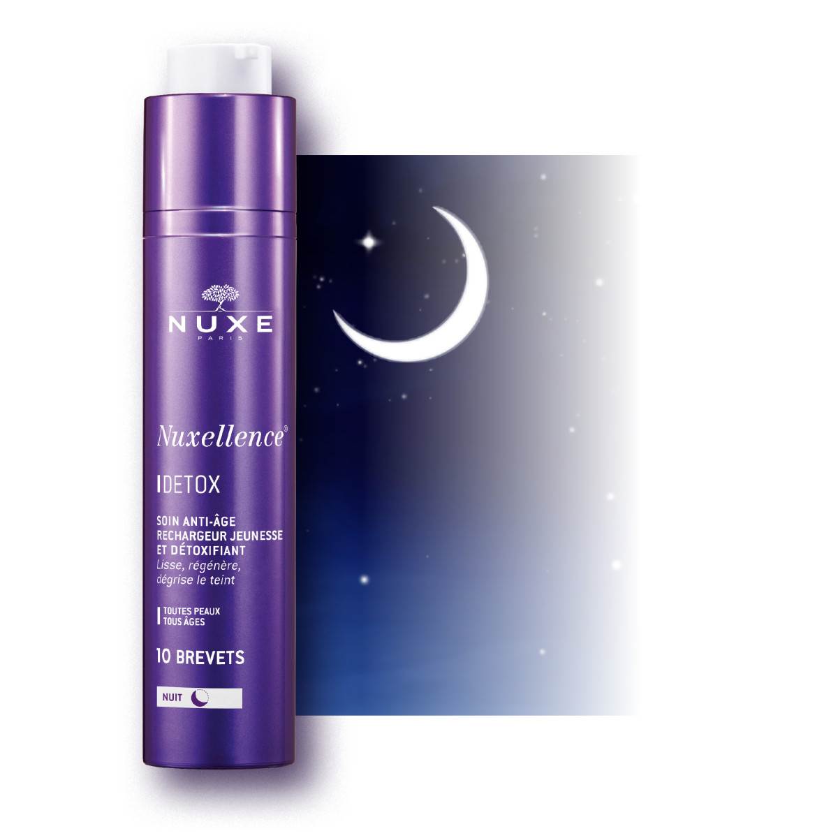 Inspiriran velikom moći biljaka, Laboratorij NUXE osmislio je Nuxellence® DETOX - prvu svakodnevnu noćnu detoksikacijsku njegu koja pojačava autolizu - proces detoksikacije kože, kako bi omogućila temeljito uklanjanje svih toksina iz kože tijekom noći te ubrzala njezinu obnovu. Zahvaljujući Super-Detox kompleksu s ekstraktom albicije (drveta svile) i šećera dobivenih biotehnologijom, ovaj revolucionarni noćni fluid stimulira detoksikaciju stanica, dok cvjetovi pasiflore, anchuse i maka u srcu stanica obnavljaju oštećenu mitohondrijalnu DNA i pune kožu energijom.
