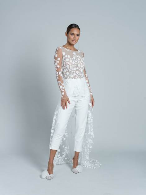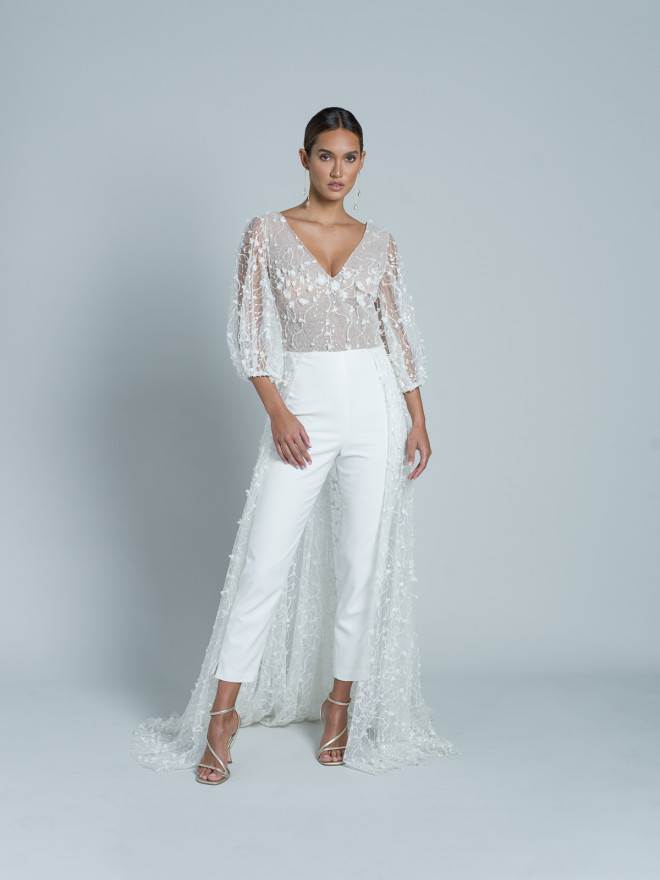 A bridal kombinezon koji je stekao status kultnog, onaj je s potpisom slavne dizajnerice vjenčane mode, Rime Arodaky. Ime mu je Patsy, izrađuje se od kombinacije tkanina, svile i talijanske čipke, a osvaja overskirtom te skladnom kombinacijom s trendi cipelama za vjenčanje.