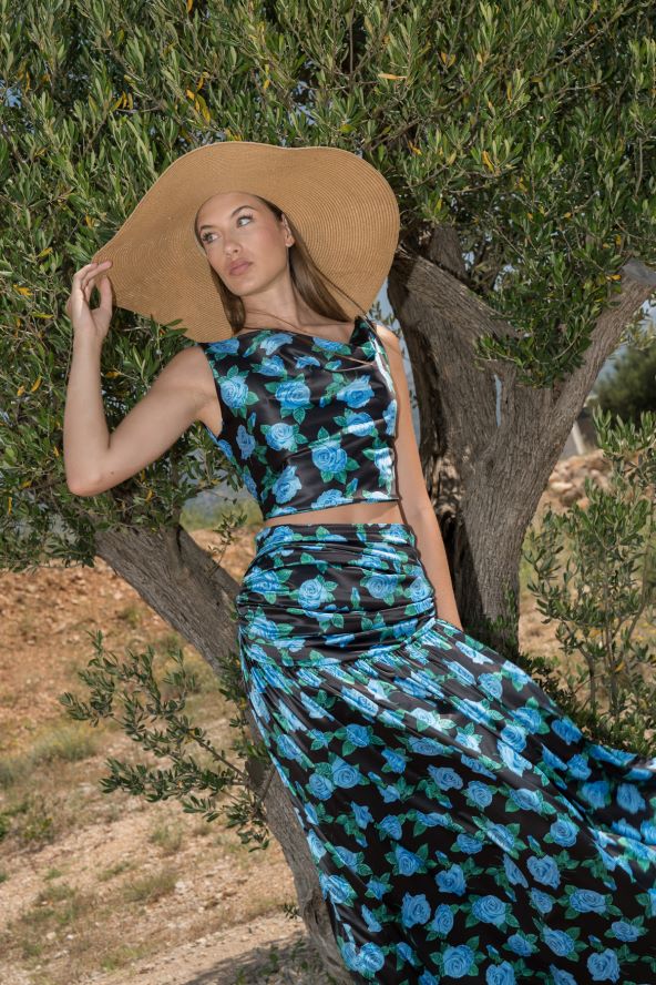 Paleta se nastavlja i u raskošnijim tonovima – cvjetni komplet topa i suknje evocira duh Mediterana, miris soli i starinske vrtove, dok sjajna ružičasta haljina zanimljivog kroja otkriva večernje lice ljeta – zavodljivo, ali neopterećeno. Tu su i komadi za posebne prigode: bijeli seksi set s korzetom i suknjom, profinjen i smion, te kratka, nabrana haljina od smeđe svile koja prianja uz tijelo poput druge kože.