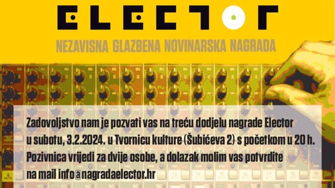 Hrvatska elektronička glazbena scena iz godine u godinu bilježi sve veći broj izdanja te uspjehe na regionalnoj, ali i svjetskoj glazbenoj sceni. Zato vas pozivamo da podržite scenu i popratite treće izdanja dodjela nagrade ELECTOR putem livestreama na brojnim domaćim portalima i putem Facebook stranice nagrade Elector te ELECTOR weba.