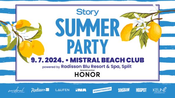 Uz generalnog partnera HONOR, Story Summer Party podržavaju Mistral Beach Club, Radisson Blu Resort & Spa, Laufen, Ina, Sensation Tonic, HGSPOT, Keune Haircosmetics, Pet Centar, PPD Global – vodeća distribucija alkoholnih pića i illy kave (Aperol Spritz i Campari Spritz).