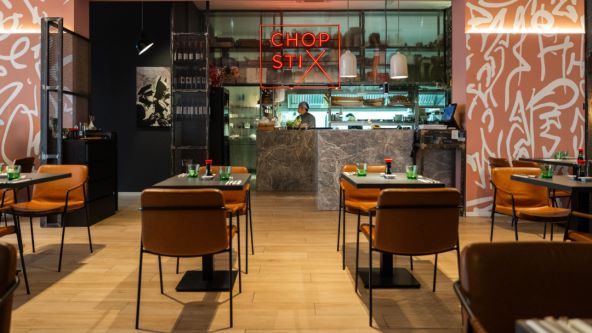 U širokoj ponudi panazijskih jela koja nudi Chopstix nalazi se velika selekcija sushija koji se radi a la minute po narudžbi gosta, razne rolice i salate, ramen, bao buns, ručno rađene gyoze, teppanyaki, poke bowls, razni azijski rezanci, curry-ji te maštoviti deserti.