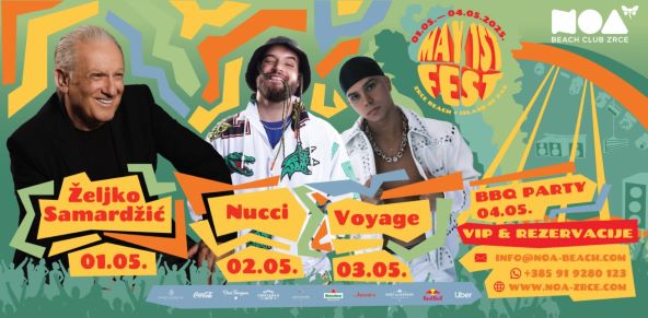 A ove godine je line-up najbolji do sad! Prvi dan festivala, 01.05. u Nou stiže stari lav - Željko Samardžić! Jedan od najpopularnijih regionalnih pjevača idealan je za otvorenje četverodnevnog prvomajskog mini godišnjeg kojeg si morate priuštiti. U petak, 02.05., na Zrće stiže - Nucci. Pjevač i autor broji milijunske preglede na YouTube-u i redovito se nalazi u YT trendingu. A tamo mu društvo prati treći u nizu trojice veličanstvenih - Voyage. Voyage je na redu u subotu, 03.05. za zakucavanje od kojeg je plan oporavljati se u nedjelju, 04. svibnja na zadnji dan festivala kad nas očekuje najbolji BBQ party - onaj uz more!