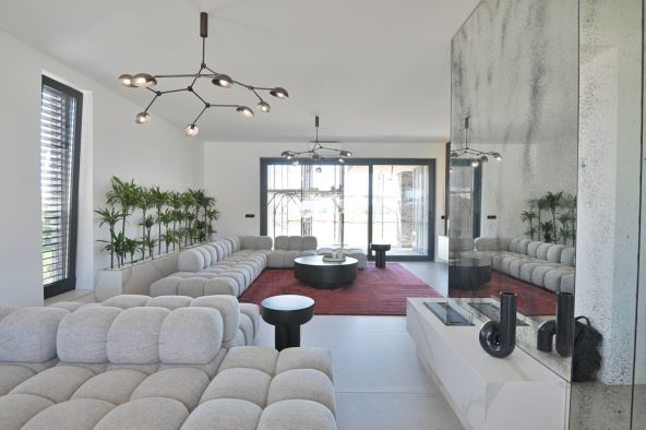 U impresivnoj kući od čak 540 četvornih metara u Novskoj svaki je prostor dizajniran s posebnom pažnjom. Već na ulazu oduševljava pogled na impozantno stepenište koje nagovještava eleganciju i raskoš ostatka doma. Prizemlje je koncipirano kao otvoreni prostor u kojem ključnu ulogu ima prirodna svjetlost – dvije velike staklene stijene omogućuju pogled na okolnu prirodu i stvaraju snažnu poveznicu interijera i eksterijera.