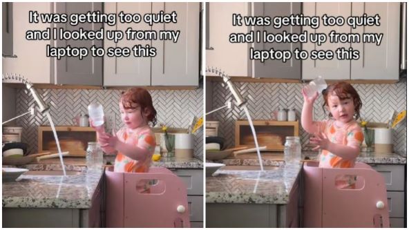Mama je radila od kuće, a u jednom trenutku joj je postalo sumnjivo što je u kući jako tiho dok se njezin kći igra. Kad je pogledala prema kuhinji, imala je što za vidjeti. Njezina kći je stajala na klupi ispred sudopera, držala čašu u koju je točila vodu, a onda se polijevala. Djevojčica je pronašla način kako se zabaviti, a Ashley nije znala treba li se smijati ili uzrujati zbog toga.