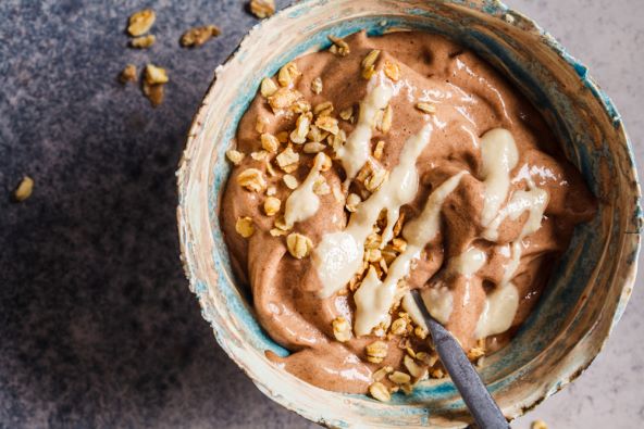 Dan ranije ili barem četiri sata ranije zaledite oguljene komadiće banana. U blender stavite zaleđene banane, ohlađeno kokosovo mlijeko ili vrhnje (obavezno ono iz limenke jer je masnije), zatim namaz od indijskih oraha ili kikirikija, badema, oraha, ovisno što volite. On će dati dodatnu kremoznost.