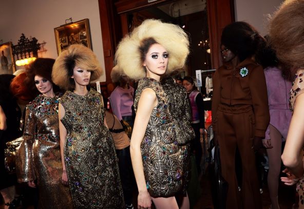 Kosa na reviji je priča za sebe, jer za puni dojam je bilo pptrebno pripremiti čak 108 voluminoznih perika, u rasponu od bakrene do tamno smeđe do blond nijanse Sharon Tate, a kreirao ih je stilist za kosu Duffy: “Iz perspektive ljepote, Marc je želio ovu ideju viška. Oblik je jednostavan, ali sugestija je disko atmosfera kasnih 60-ih i ranih 70-ih, a to su Supremes." Naravno, sve uz korištenje velikih količina laka za kosu.