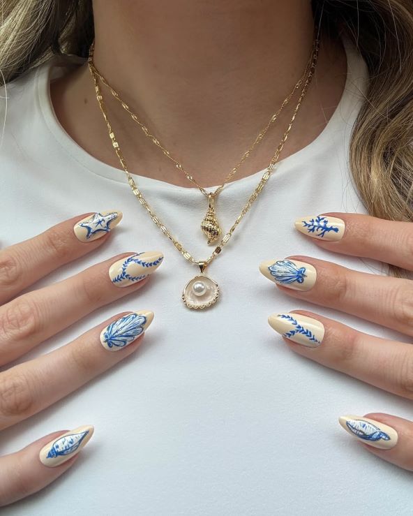 Kombinira tirkizne i plave nijanse koje podsjećaju na kristalno more, bijele i bež tonove koji evociraju pijesak, sedefaste i shimmer efekte koji imitiraju školjke i bisere, zlatne detalje koji dodaju dozu luksuza, poput sunčevih zraka na koži, ali i 3D ukrase poput mini školjkica, morskih zvijezda ili bisera.