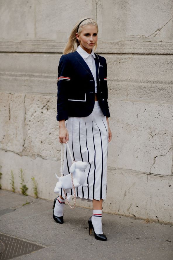 Midi suknja i prugasta majica idealna su kombinacija za ljetne lookove: lepršava, prozračna suknja A kroja uvijek je profinjena, a T-shirt koji prati siluetu dat će joj onaj mornarski ljetni stil. Cijeloj kombinaciji dodajte chic zlatne komade nakita.