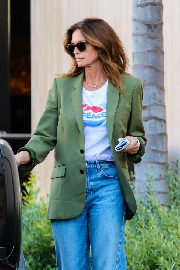 Svi već jako dobro znamo da su blazeri dio vječne modne kapsule koja se uvijek nosi bez obzira na trend, a pogotovo u proljetno vrijeme kada nam služe umjesto jakni. Cindy je odabrala zelenu boju blazera (koja je, inače, trenutno iznimno popularna i bit će za nadolazeće razdoblje) te ga je kombinirala s bijelom majicom natpisa 'Peace'.
