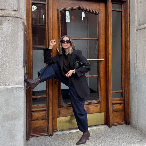 Blejzer, traperice i čizme na petu