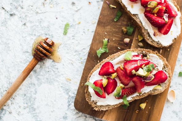 Na grilani kruh prvo stavite kremu od sira, razmažite je po cijeloj površini kruha, zatim po njoj rasporedite jagode i ukrasite mentom. Ako vas privlači kombinacija s orašastim plodovima, odaberite bademe, orahe ili pistacije, očistite, nasjeckajte na sitno i dodajte po vrhu.