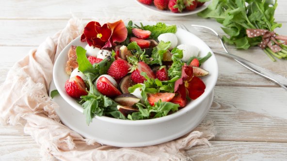 Za ručak će biti neobična, ali ukusna salata. U većoj posudi pomiješajte sitno nasjeckane sastojke: jagode (100 g), 1/2 zelene salate, jedna rajčica, jednu papriku, nemasni sir (50 g), jogurt (1/2 dl), limunov sok, sol po ukusu i tost od kriške integralnog kruha narezanog na kockice.